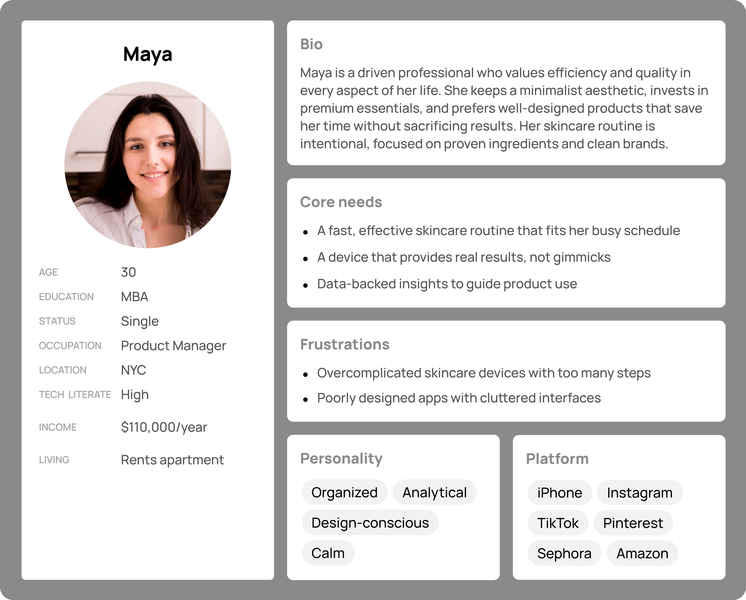 I developed detailed User Personas and Journey Maps to visualize the emotional highs and lows of the skincare acquisition process. By identifying "friction peaks," such as the moment a user questions a product’s price-to-value ratio, I was able to implement educational transparency markers (like ingredient deep-dives) to reassure the user.